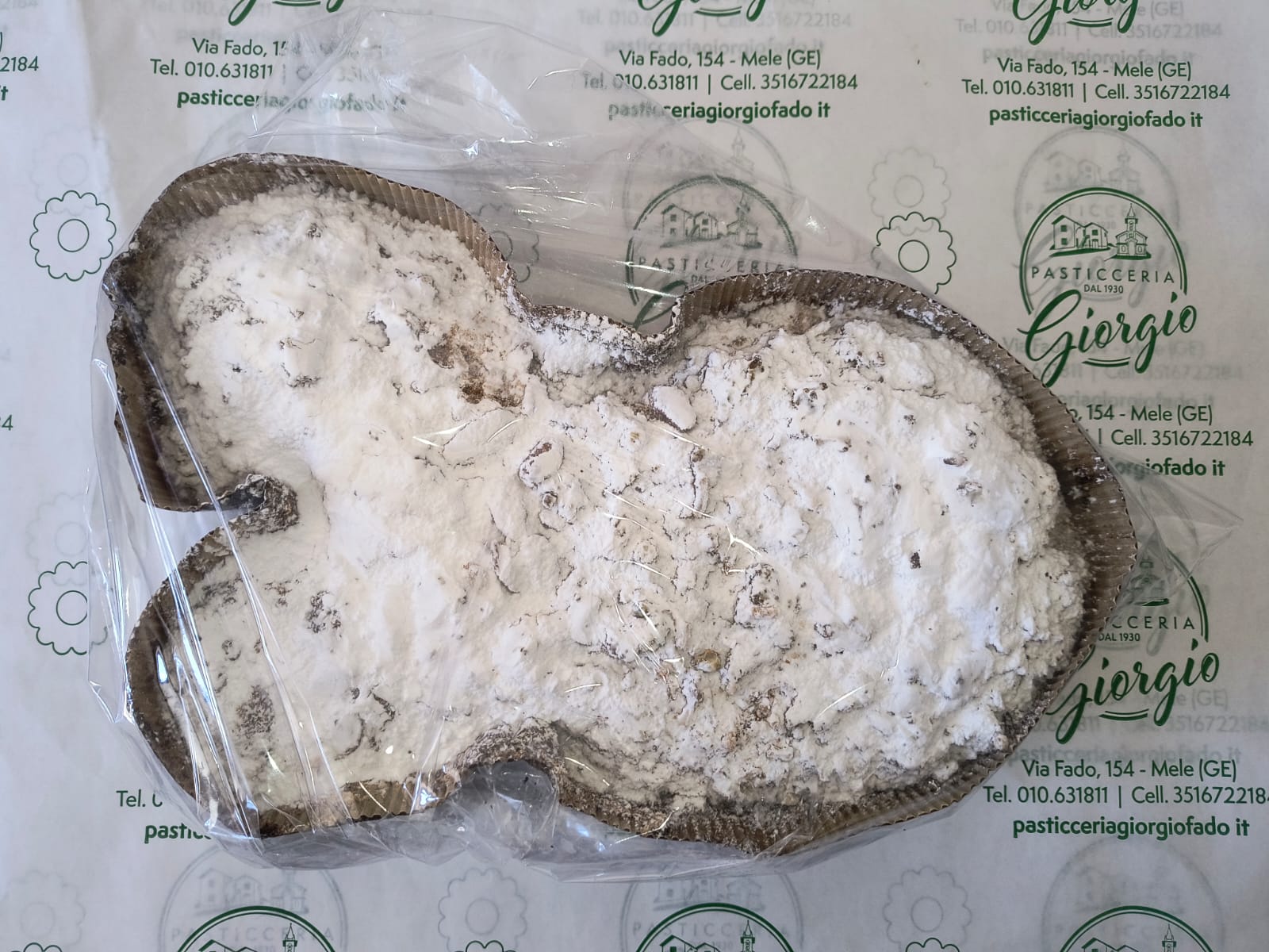 Prodotto dolciario da forno - Ingredienti: farina di GRANO tenero tipo”00”, zucchero, LATTE, margarina, UOVA, uvetta, scorze di arancia candita (arancio, sciroppo di glucosio-fruttosio, zucchero, acidificante: acido citrico, conservanti: E202, E220(come residuo)), agente lievitante (sodio pirofosfato E450i, sodio bicarbonato E500ii, amido di frumento), BURRO, conservante E 200,aromi naturali. Glassa: albume d’UOVO, NOCCIOLE, granella di zucchero, zucchero impalpabile, MANDORLE. ALLERGENI: farina di grano tenero tipo”00”, nocciole, uova, latte, burro2, mandorle. Prodotto in stabilimento che utilizza: derivati del latte e arachidi.
